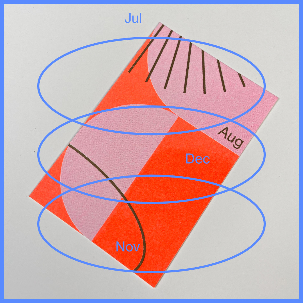 De kaarten bestaan uit drie verschillende lagen, de onderste twee vormen de eerste letter van de maand, de bovenste zijn geïnspireerd op seizoenen. Samen vormen de 12 kaarten een totaal geheel.